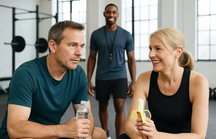 - Voor training: eet 1,5–2 uur van tevoren een lichte maaltijd met eiwitten en complexe koolhydraten (bijv. volkoren wrap met kip en groenten).